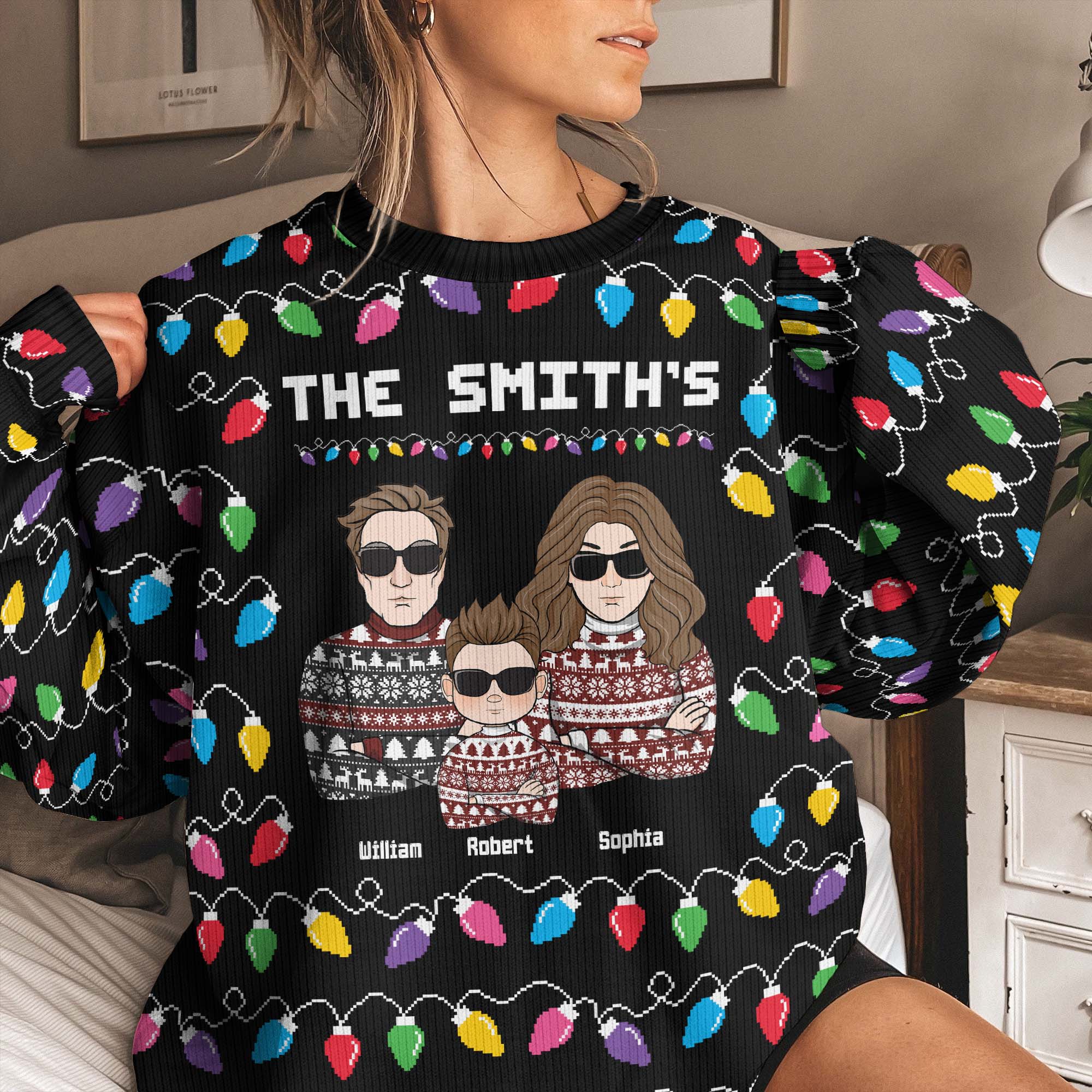 Our personalized family-matching ugly sweater is made of soft and comfortable cotton that will keep your family warm and snug. You can customize the ugly sweater with your family members’ names. You can also customize your family name. This personalized family-matching ugly sweater is a perfect gift for your dad, mom, son, or daughter who loves their family and friends.