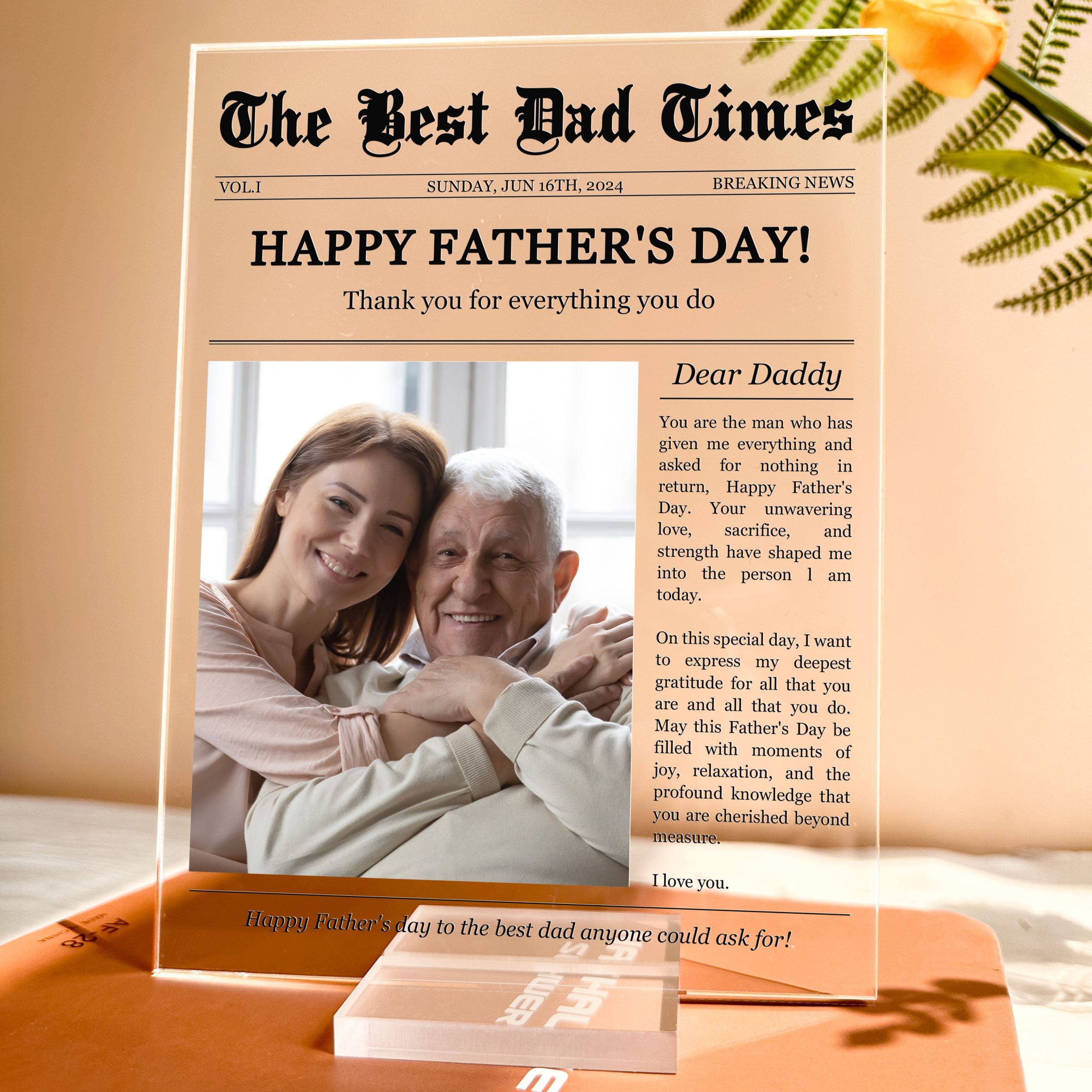 Introducing our Personalized Photo Acrylic Plaque – a unique and elegant gift that captures the essence of cherished memories and celebrates the love of a father. Crafted with precision and personalized with a nostalgic newspaper template, this acrylic plaque is sure to become a treasured keepsake for Dad. Make your gift truly unique by personalizing it with Dad’s favorite photos and memories. Whether it’s a candid snapshot from a family vacation or a posed portrait from a special occasion, our customizable design allows you to create a plaque that captures the essence of Dad’s life and the love of his family. Looking for the perfect gift to show Dad how much he means to you? Our Personalized Photo Acrylic Plaque is a thoughtful and heartfelt choice. Whether it’s a milestone birthday, Father’s Day, or just a day to celebrate him, this personalized gift is sure to touch his heart and bring a smile to his face.